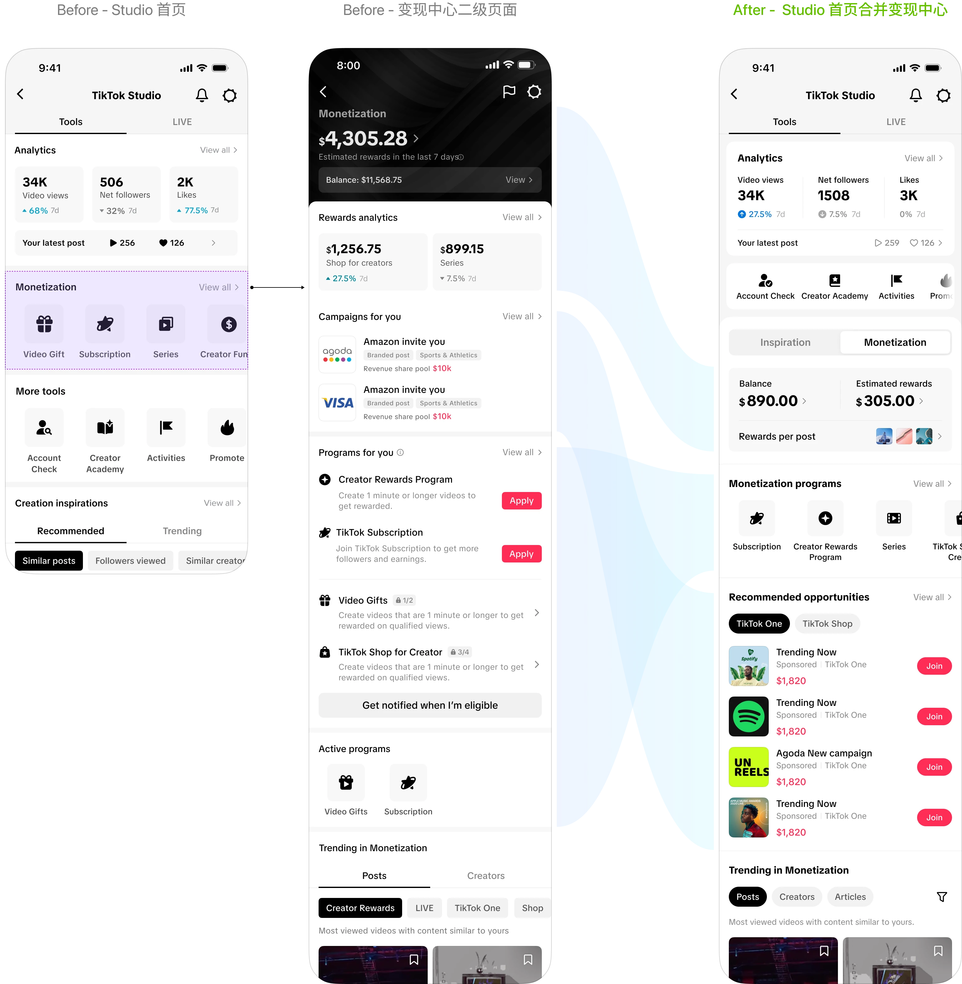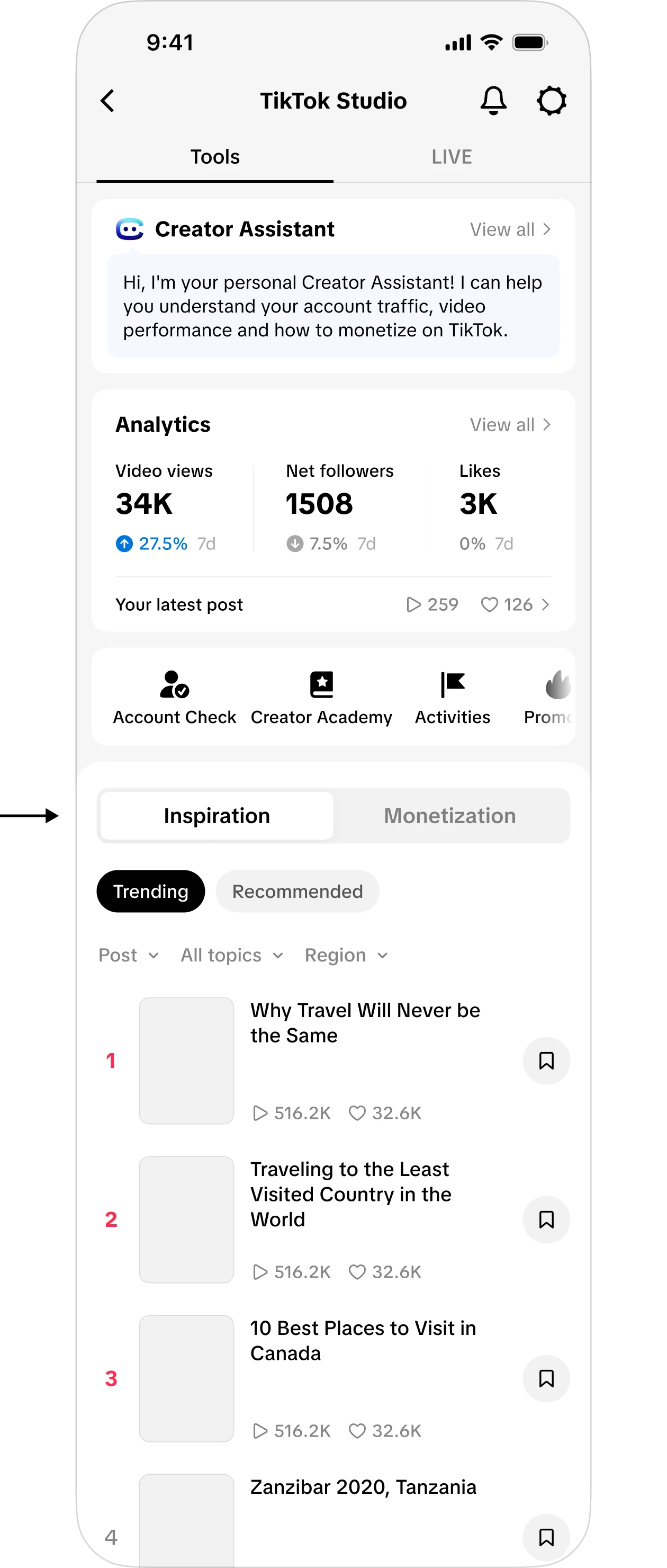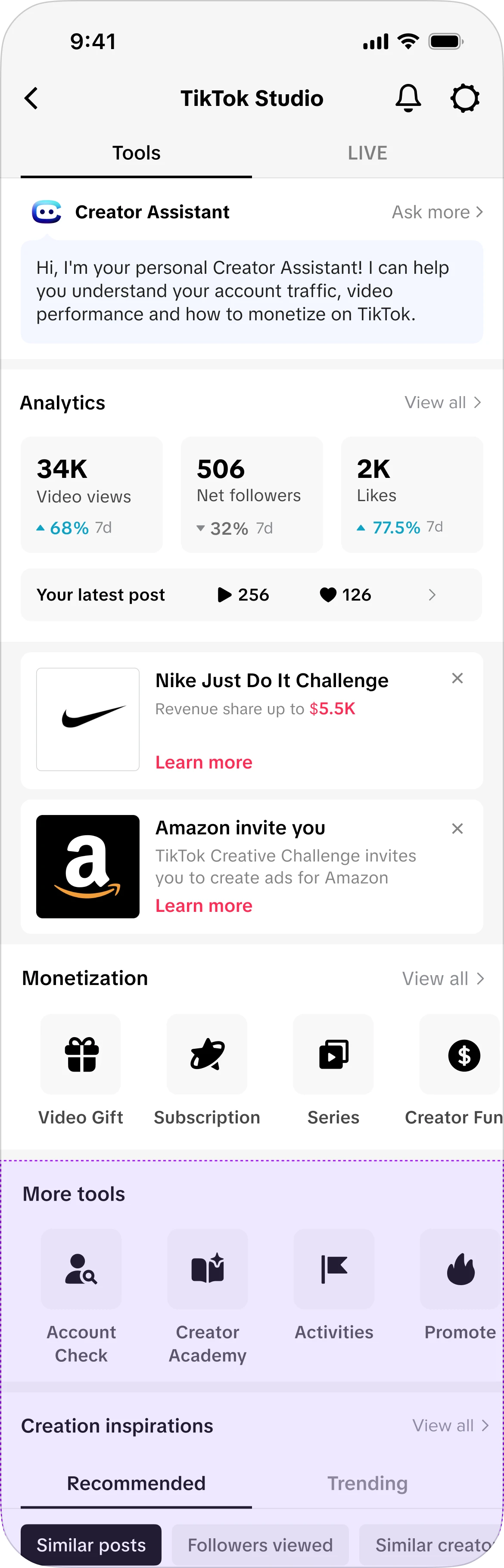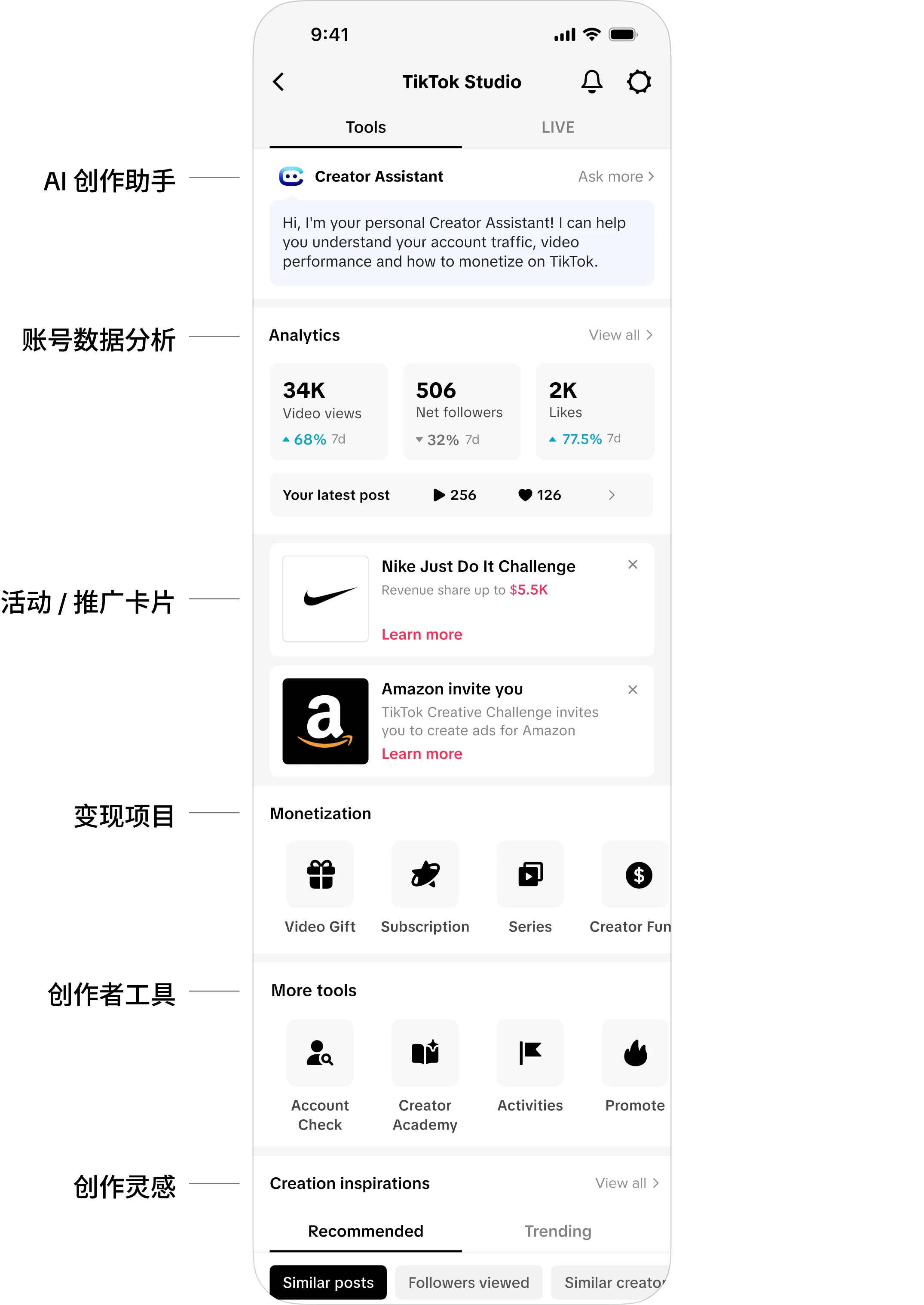 TikTok Studio 是集合了「作者教育、数据分析、作者变现、灵感发现、创作工具」等功能的综合平台(即创作者中心)。