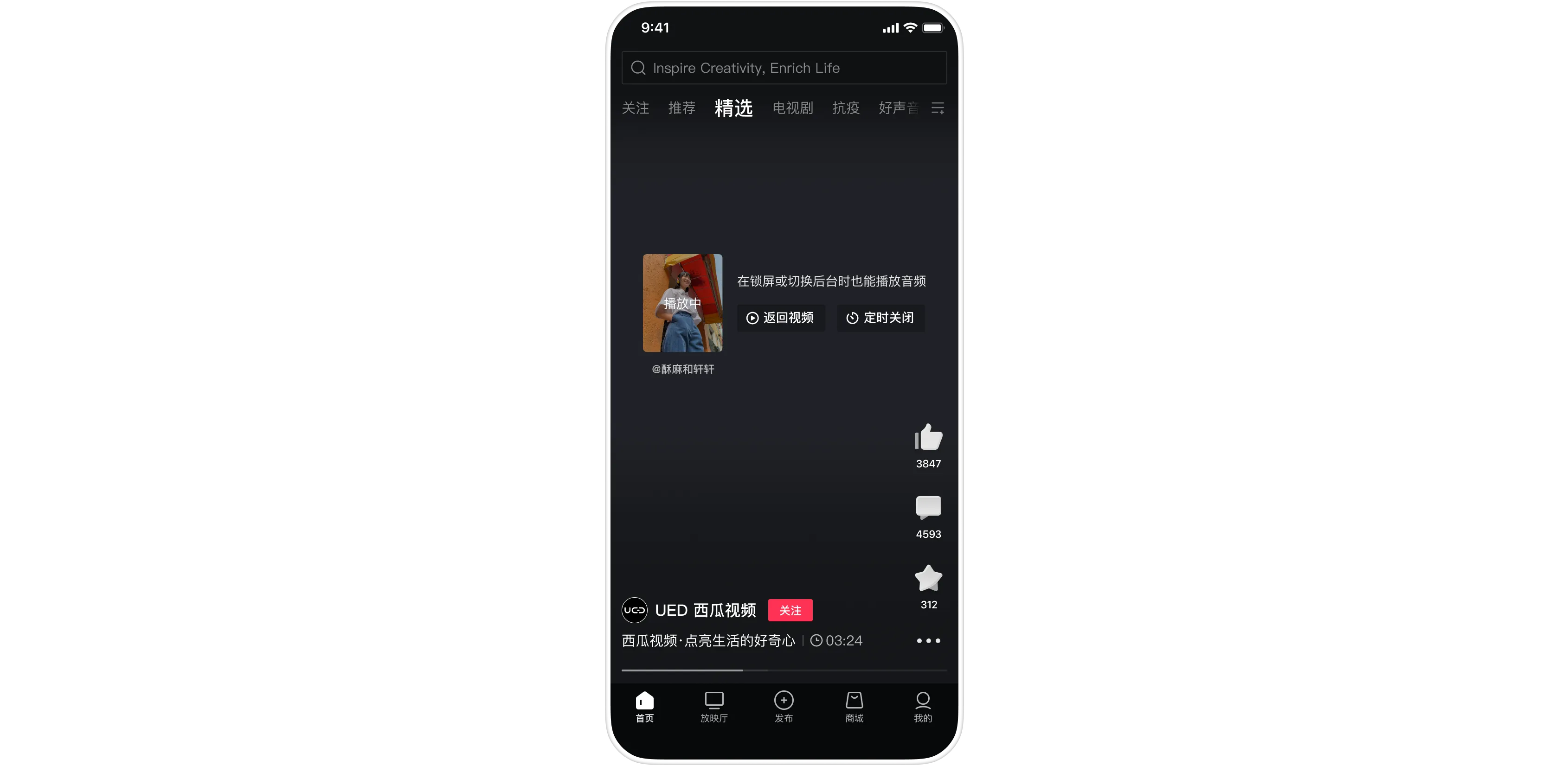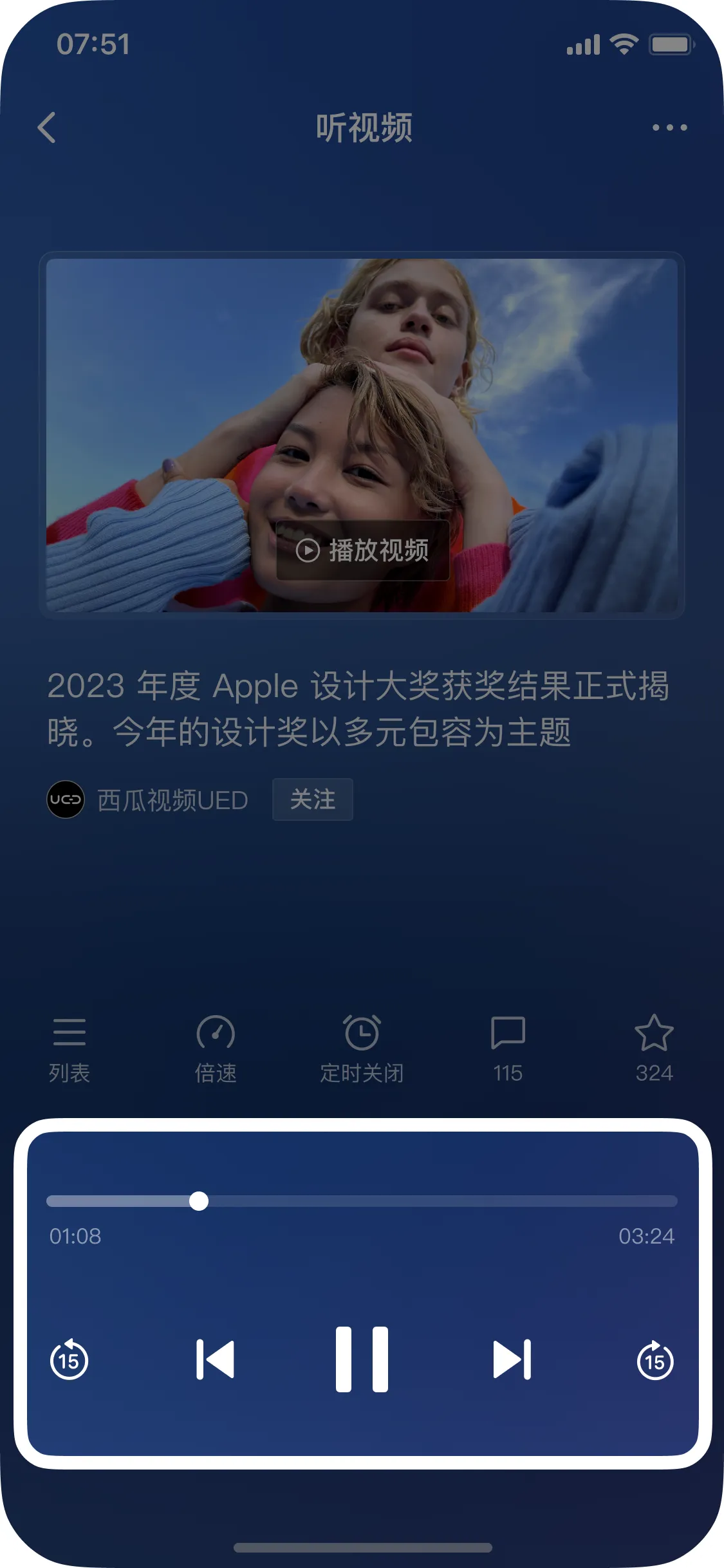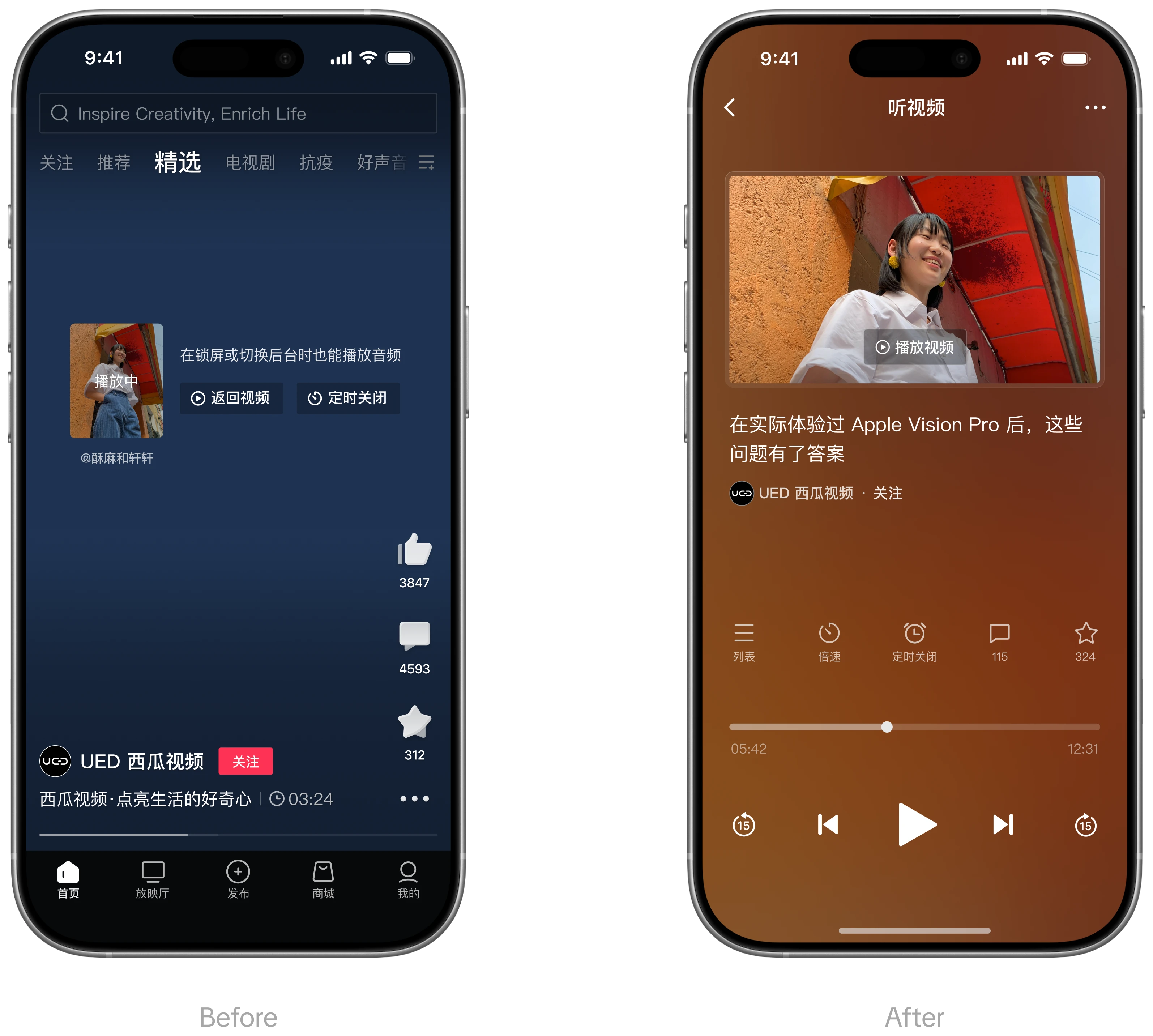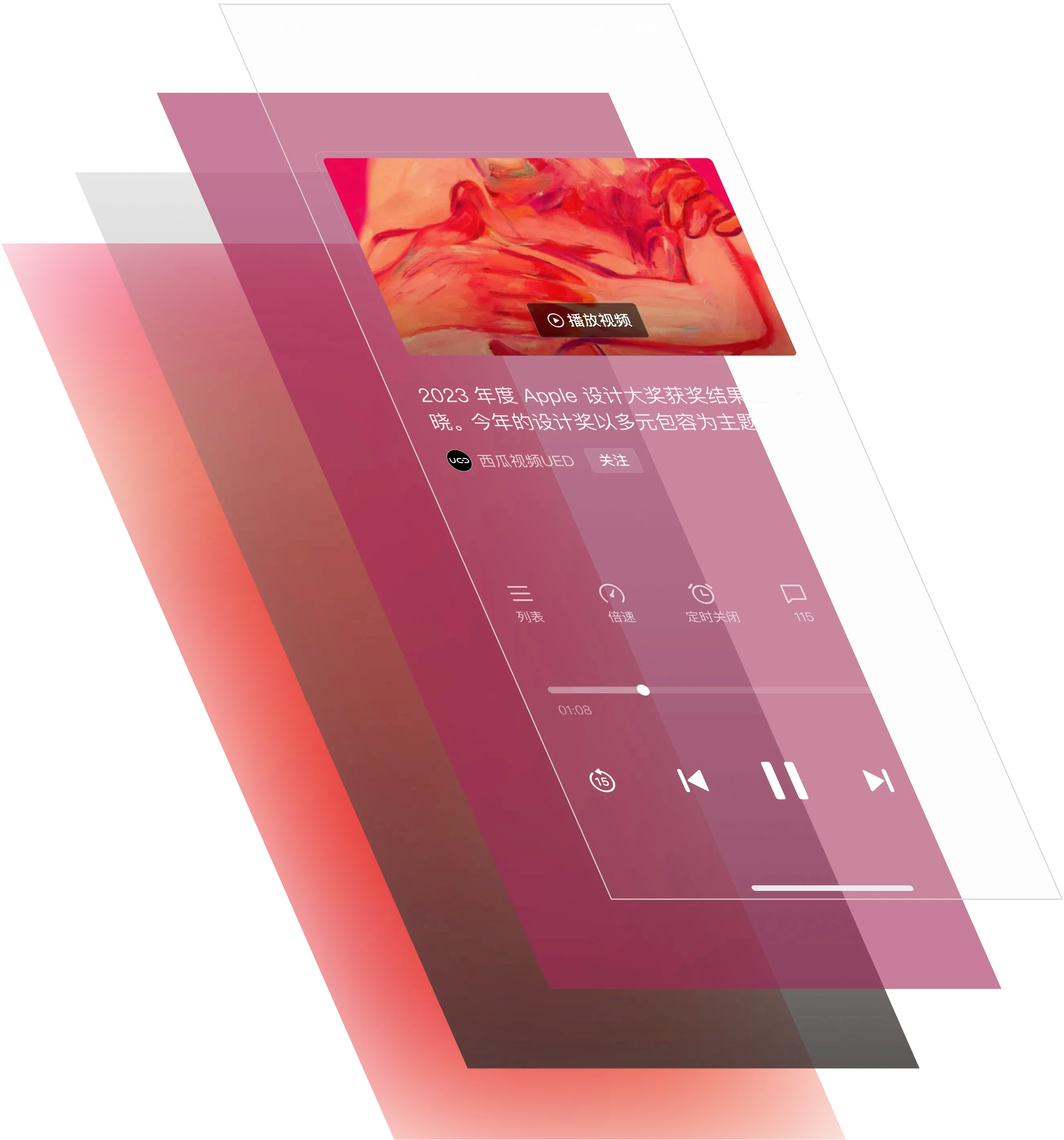 增加播放器,使视频内容能够以音频形态在前台 / 后台 稳定播放,覆盖用户开车、家务、助眠等 "不可看屏" 的场景。