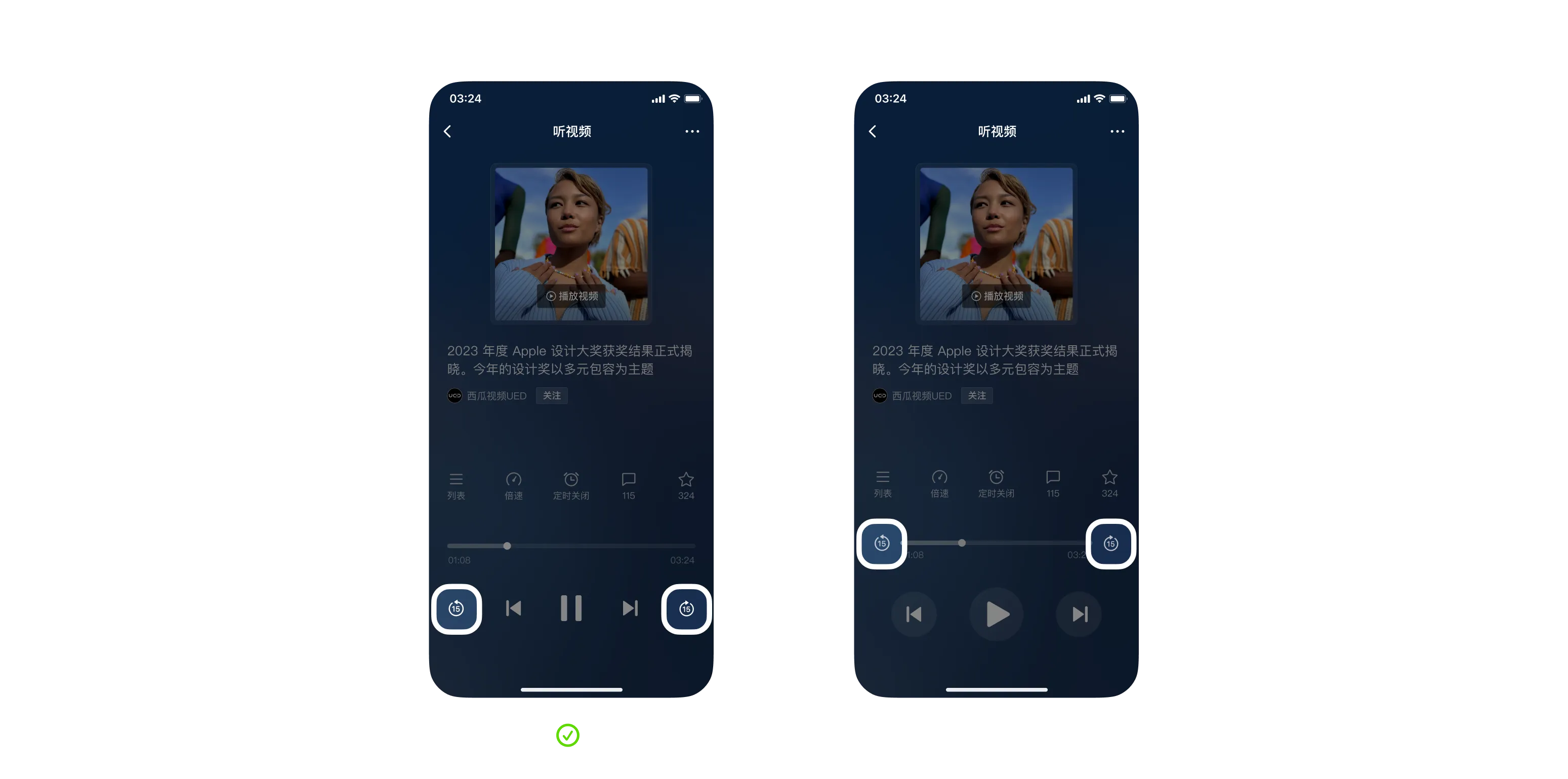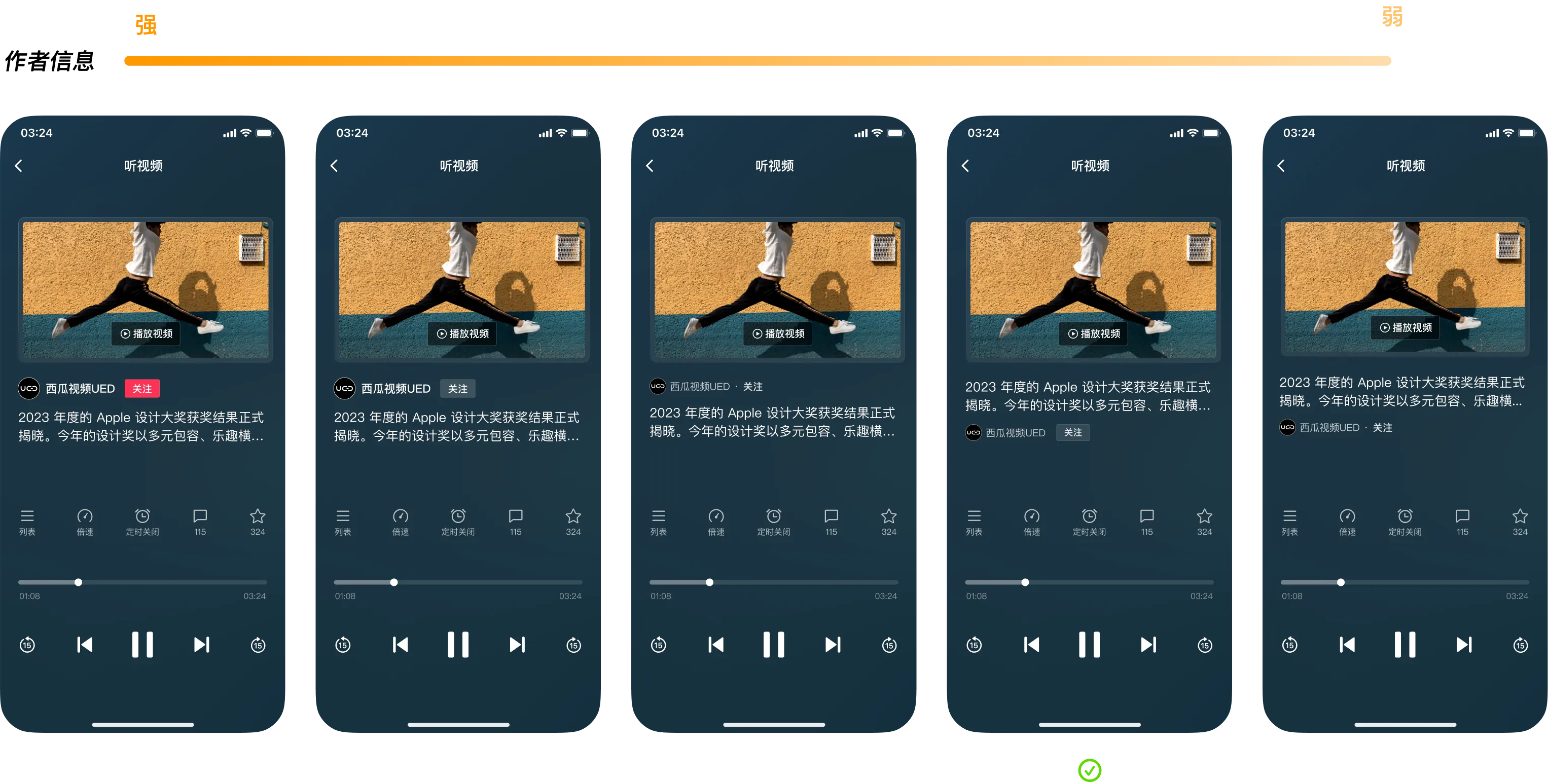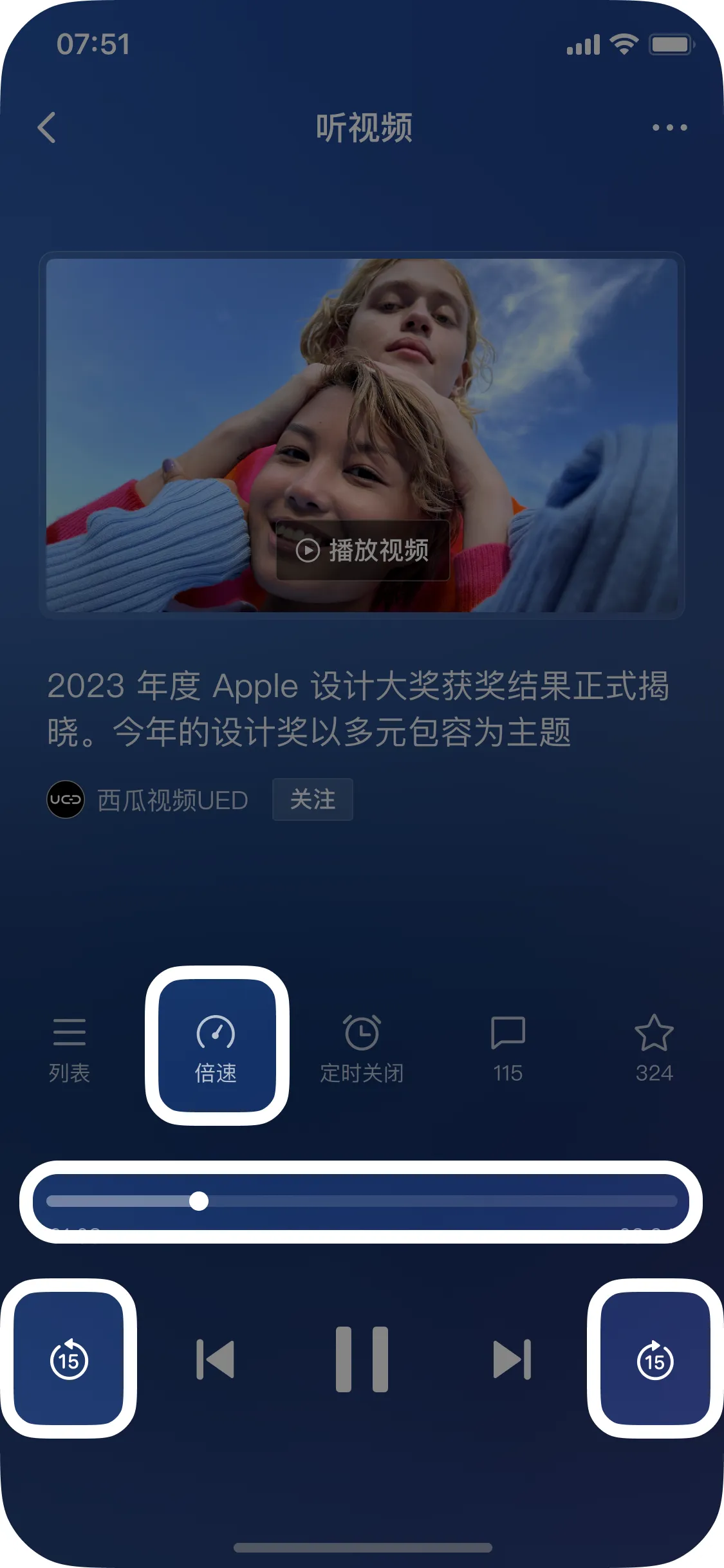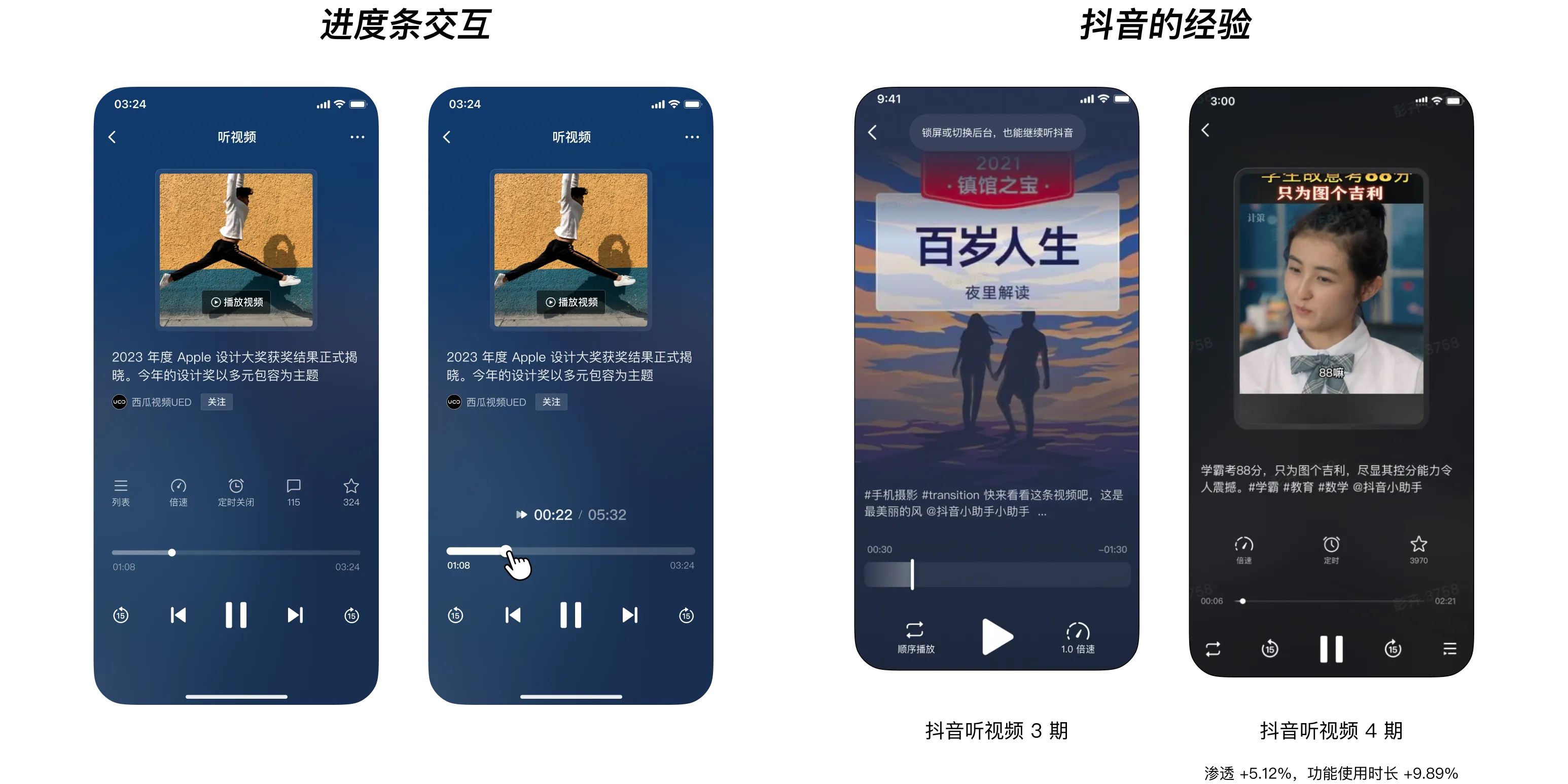 ⊙ 中长内容体裁:强化进度控制、倍速、快进快退