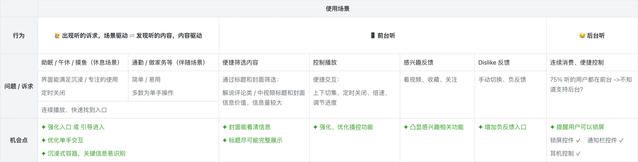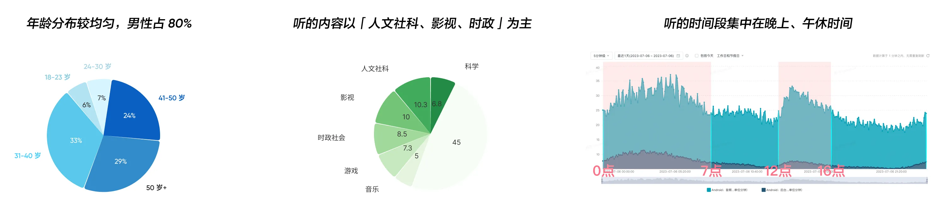 听内容用户以中老年用户为主;内容偏好集中在解说、评论等中长内容;典型使用场景:通勤、家务、睡前。